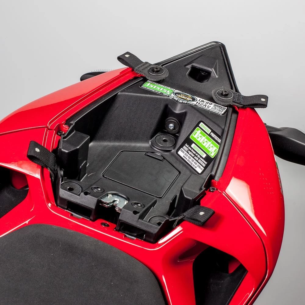 4x Custom nylon loops bolt to the 2 pillion seat strap mounting points and the 2 x rear bodywork fasteners under the rear pad. Allows easy fitting of any size/combination of Kriega US-Drypacks (5-90L).