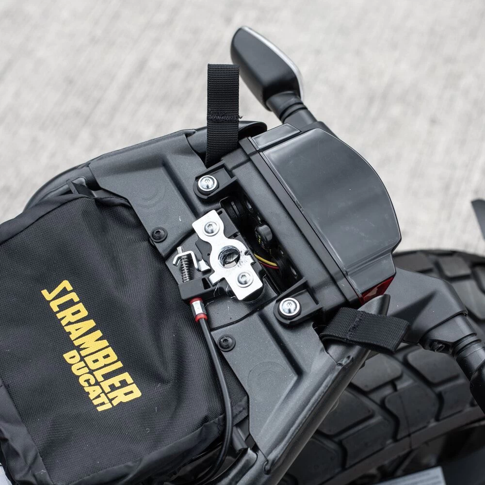 Mount the other 2 loops to the indicator mounting bolts on the underside of the rear frame using the M6 washers and existing bolts as illustrated here. Straps can be folded under the seat and rear frame when not in use. You are now ready to mount any size Kriega US-Drypack.