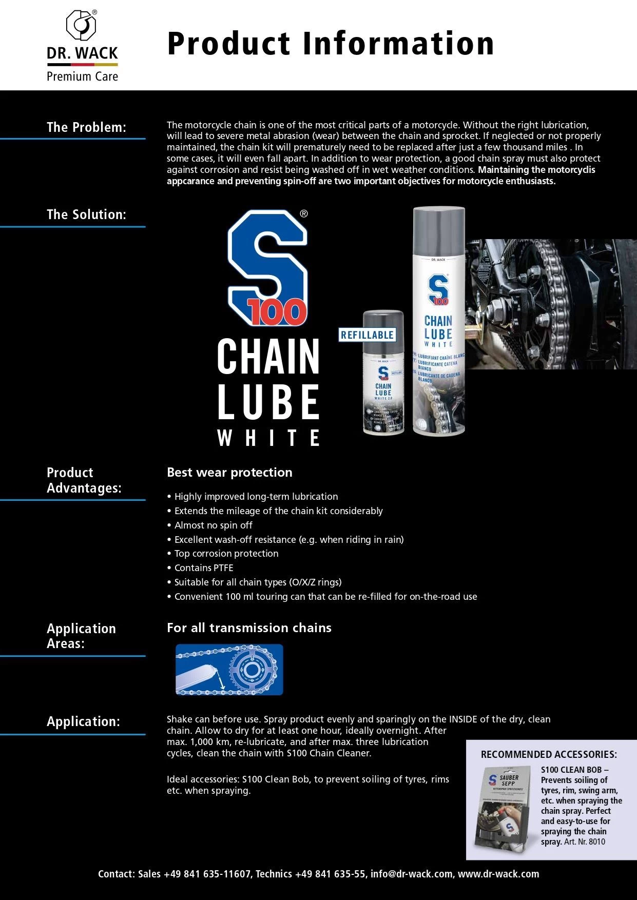 Shake can before use. Spray product evenly and sparingly on the inside of the dry, clean chain. Allow to dry for at least one hour, ideally overnight. After max. 1,000 km, re-lubricate, and after max. three lubrication cycles, clean the chain with S100 Chain Cleaner.